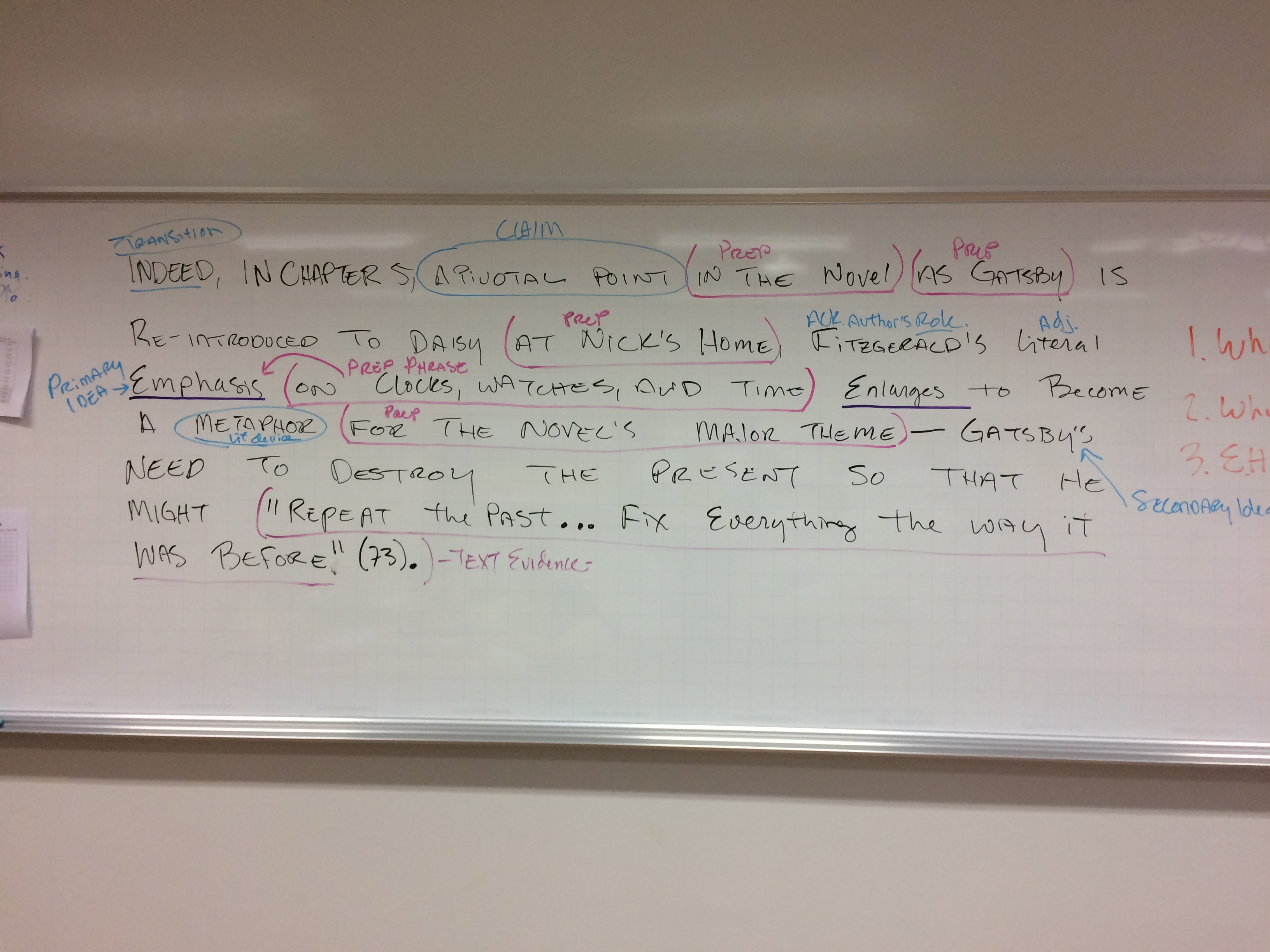 HW: Choose 2 sentences from the articles you read and break them down like I did in class today. It is not important that you use the fancy “linguist jargon” to describe what is happening, but you can look at noun phrases, prepositional phrases, verbs, and punctuation and make observations. You should do this on paper- not in the printout of the articles- so that you have lots of room to visually describe what is happening in the sentence.